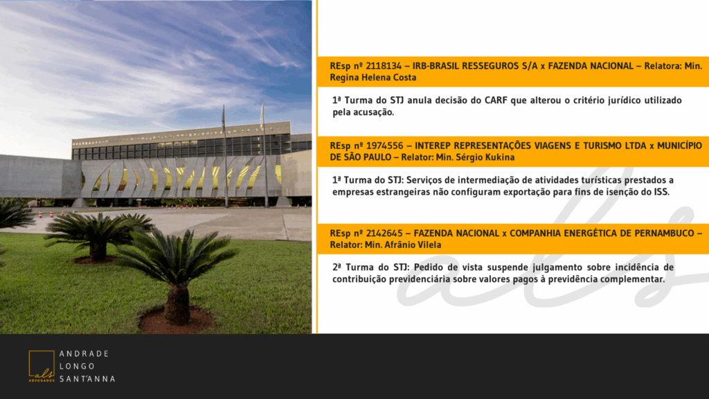 REsp nº 2118134 – IRB-BRASIL RESSEGUROS S/A x FAZENDA NACIONAL – Relatora: Min. Regina Helena Costa Tema: Mudança do critério jurídico do lançamento no julgamento administrativo. A Primeira Turma do STJ declarou a nulidade das decisões do CARF que se fundamentaram em critérios diversos daqueles constantes no auto de infração, para justificar a manutenção da […]