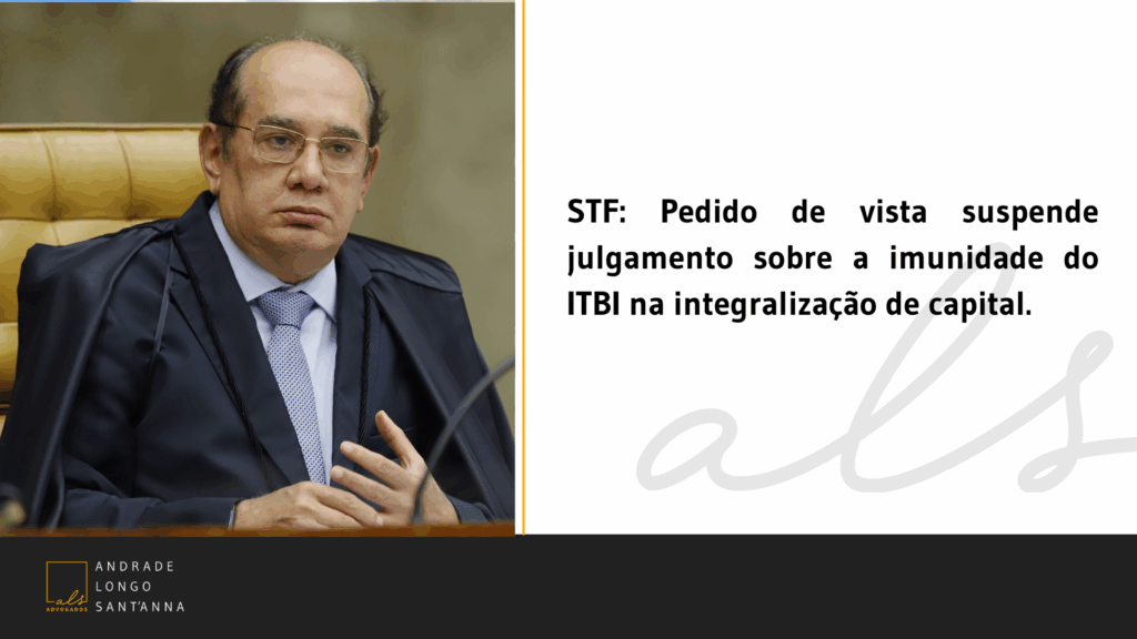 O Supremo Tribunal Federal suspendeu o julgamento do Tema 1.348 da repercussão geral, que discute se a imunidade do ITBI sobre a transmissão de bens ou direitos para integralização de capital social alcança a hipótese em que a atividade preponderante do adquirente seja a compra e venda ou locação de imóveis. Até o momento, foram proferidos três votos favoráveis ao reconhecimento da imunidade nessa hipótese.