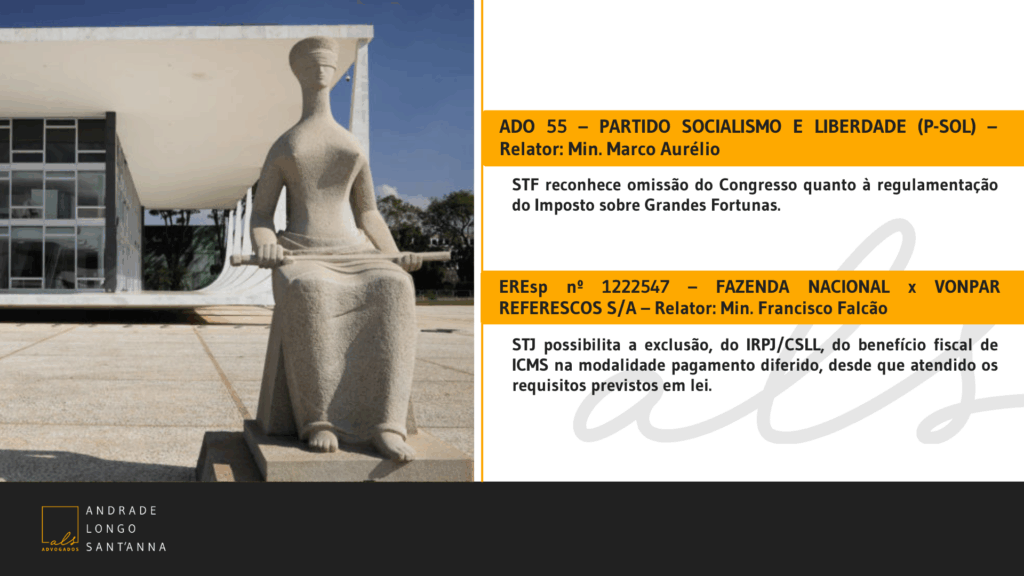 O Supremo Tribunal Federal reconheceu a mora inconstitucional do Congresso Nacional em relação à regulamentação do Imposto sobre Grandes Fortunas (IGF) por meio de lei complementar. No entanto, a Corte não fixou prazo para que tal norma fosse editada, entendendo que a decisão tem caráter de “advertência” ao Poder Legislativo.